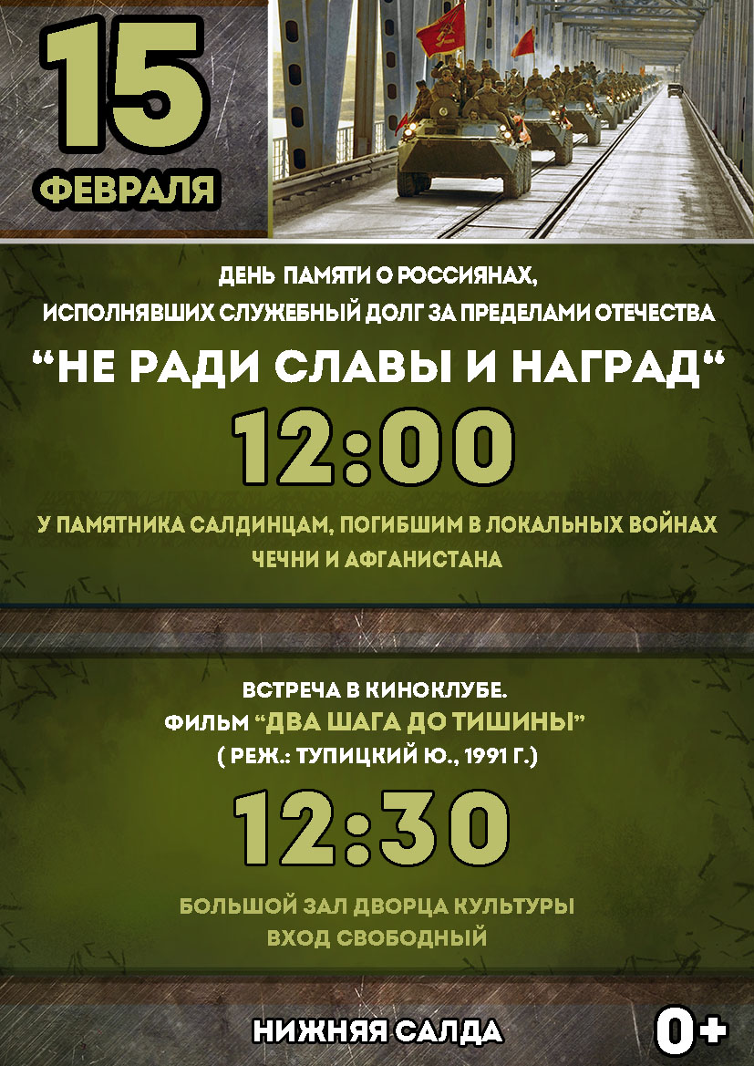 Приглашаем на митинг День памяти о россиянах, исполнявших служебный долг за пределами Отечества "Не ради славы и наград" 15 февраля в 12:00. Митинг состоится у Памятника салдинцам, погибшим в локальных войнах Чечни и Афганистана.