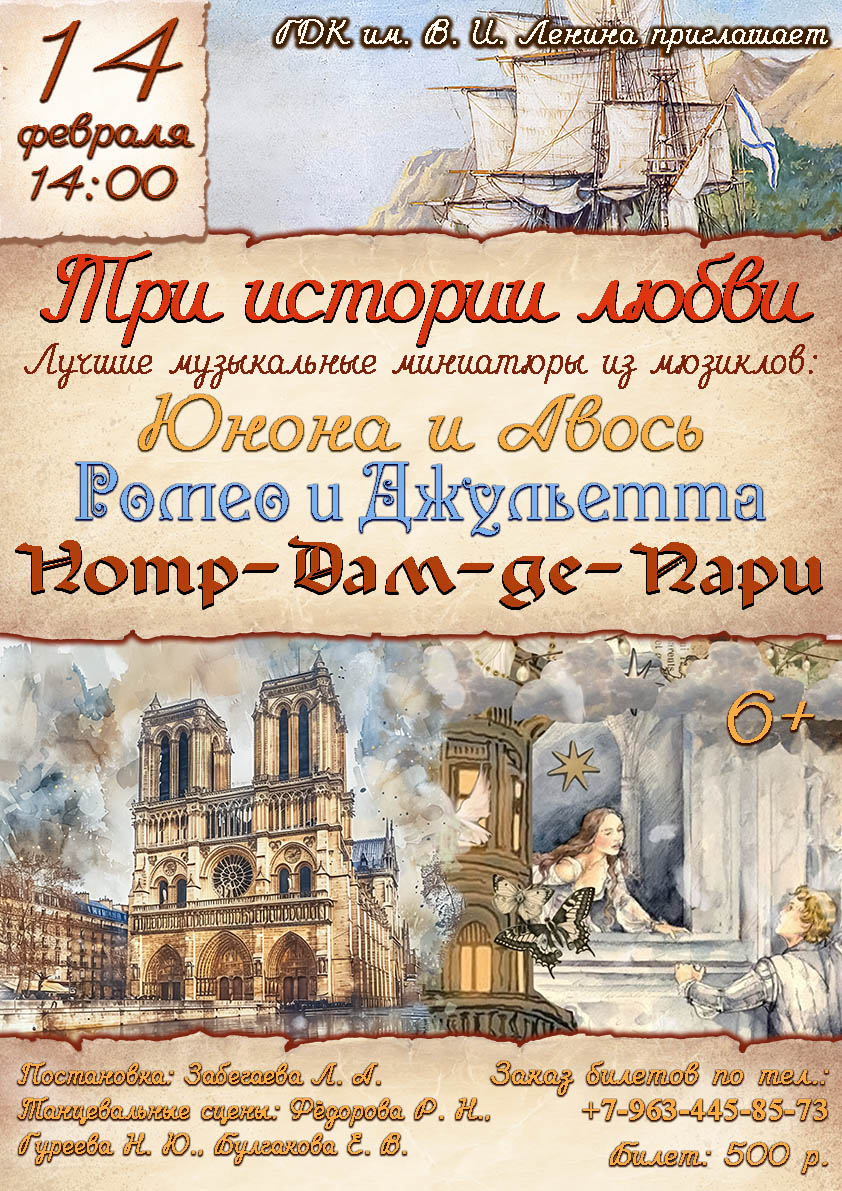 14 февраля в 14:00 приглашаем в ГДК им. В.И. Ленина на мюзикл-шоу «Три истории любви»!