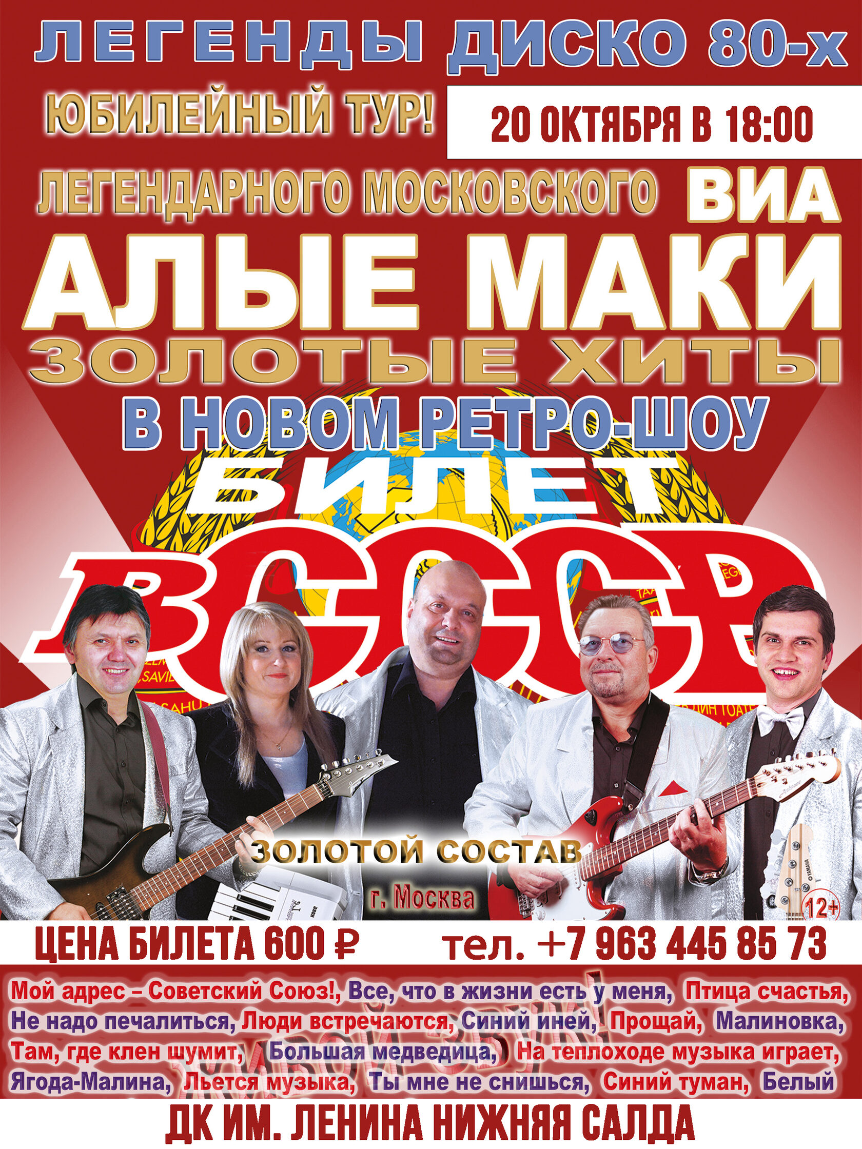 20 октября в 18:00 в ГДК им. Ленина г. Нижняя Салда состоится ЛЕГЕНДАРНОЕ РЕТРО ШОУ «БИЛЕТ В СССР!» ВИА «АЛЫЕ МАКИ» (г. Москва), нач. 18.00 ц. от 600р., бронь билетов по тел.: 89634458573